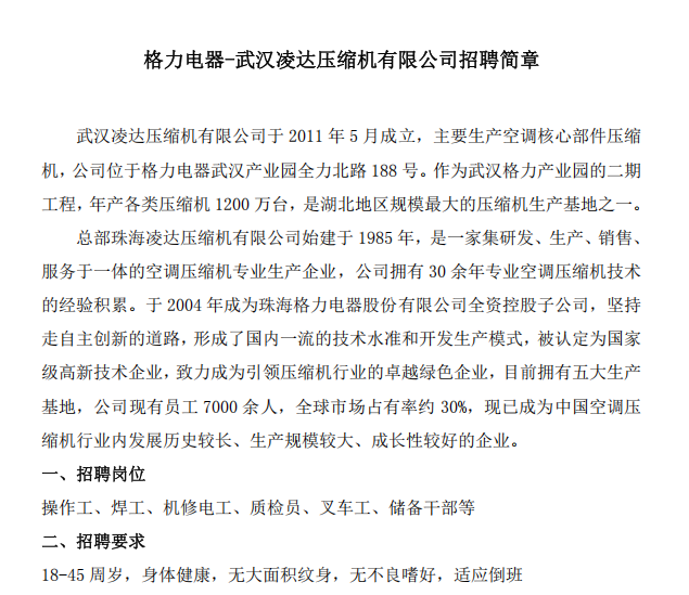 格力电器—武汉凌达压缩机有限公司2025年招聘信息