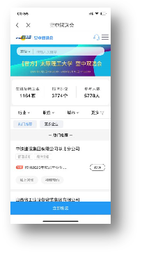 点击【报名参会】,填写【选择简历】【填写求职意向】,浏览企业招聘信息进行【投递】